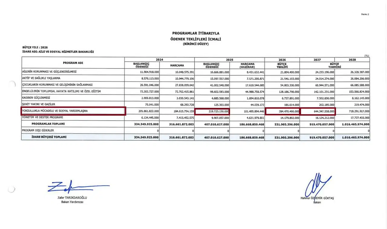 İktidarın açıkladığı 2026 ve 2027 bütçe programında dikkat çeken artışlar yaşandı. Aile ve Sosyal Hizmetler Bakanlığı’nın yoksullukla mücadele ve sosyal yardımlaşma kalemi, 2026 yılı için 284 milyar 470 milyon lira iken, 2027 yılında 644 milyar 347 milyon lira olarak belirlendi.
