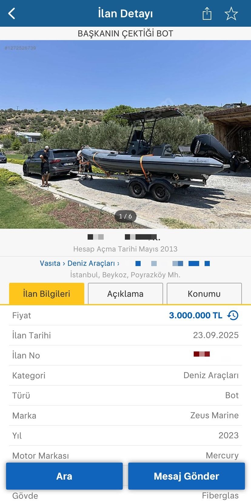 İlan detaylarında da Saran’a ait olduğu vurgulanırken botun marka ve teknik özelliklerine de yer verildi.